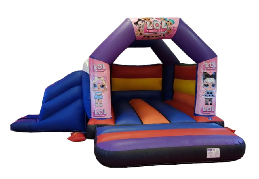 One of our great multi-coloured bouncy castle and slide combo, the slide adds more fun to the experience and goes down very well with the kids.