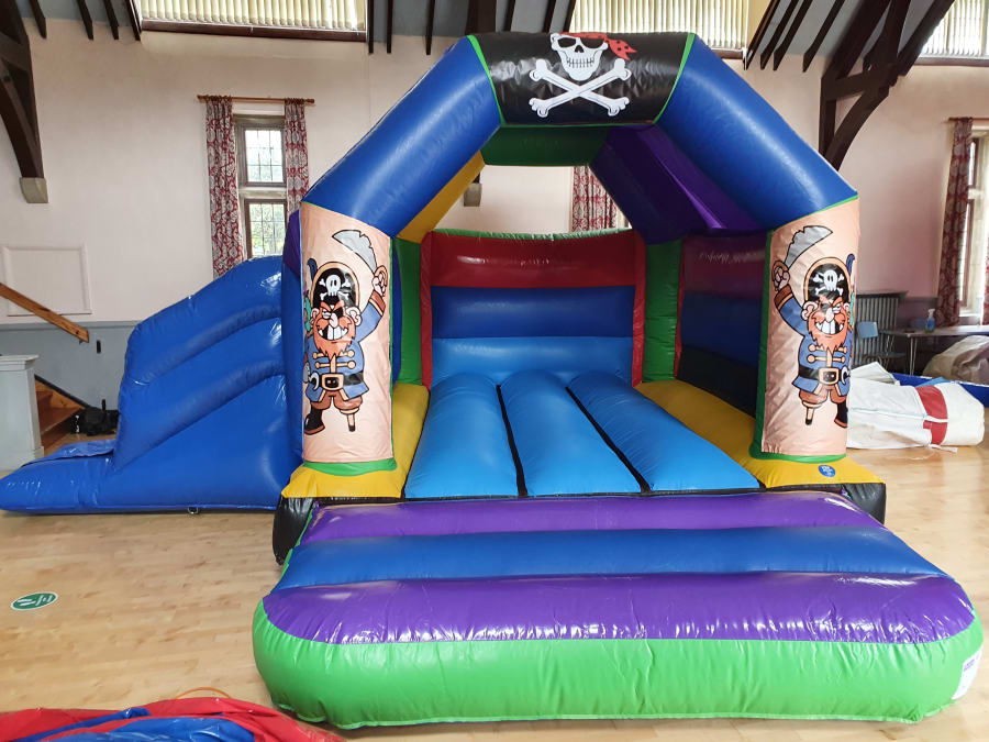 One of our great multi-coloured bouncy castle and slide combo, the slide adds more fun to the experience and goes down very well with the kids.