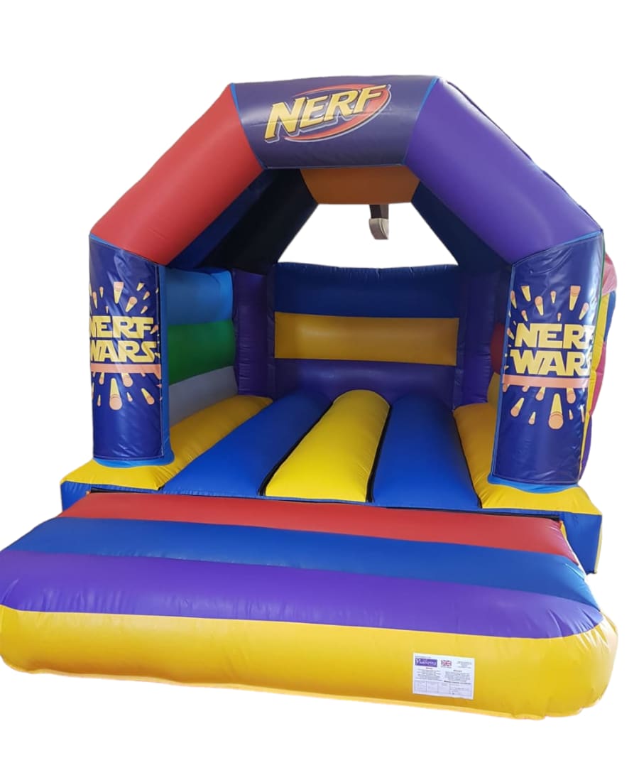 Here is our Nerf bouncy castle, a multi coloured castles with a Nerf design on the front.