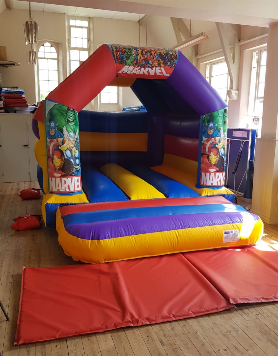 Here is our Marvel bouncy castle, a multi coloured castles with a Marvel design on the front showing a range of Marvel Characters.