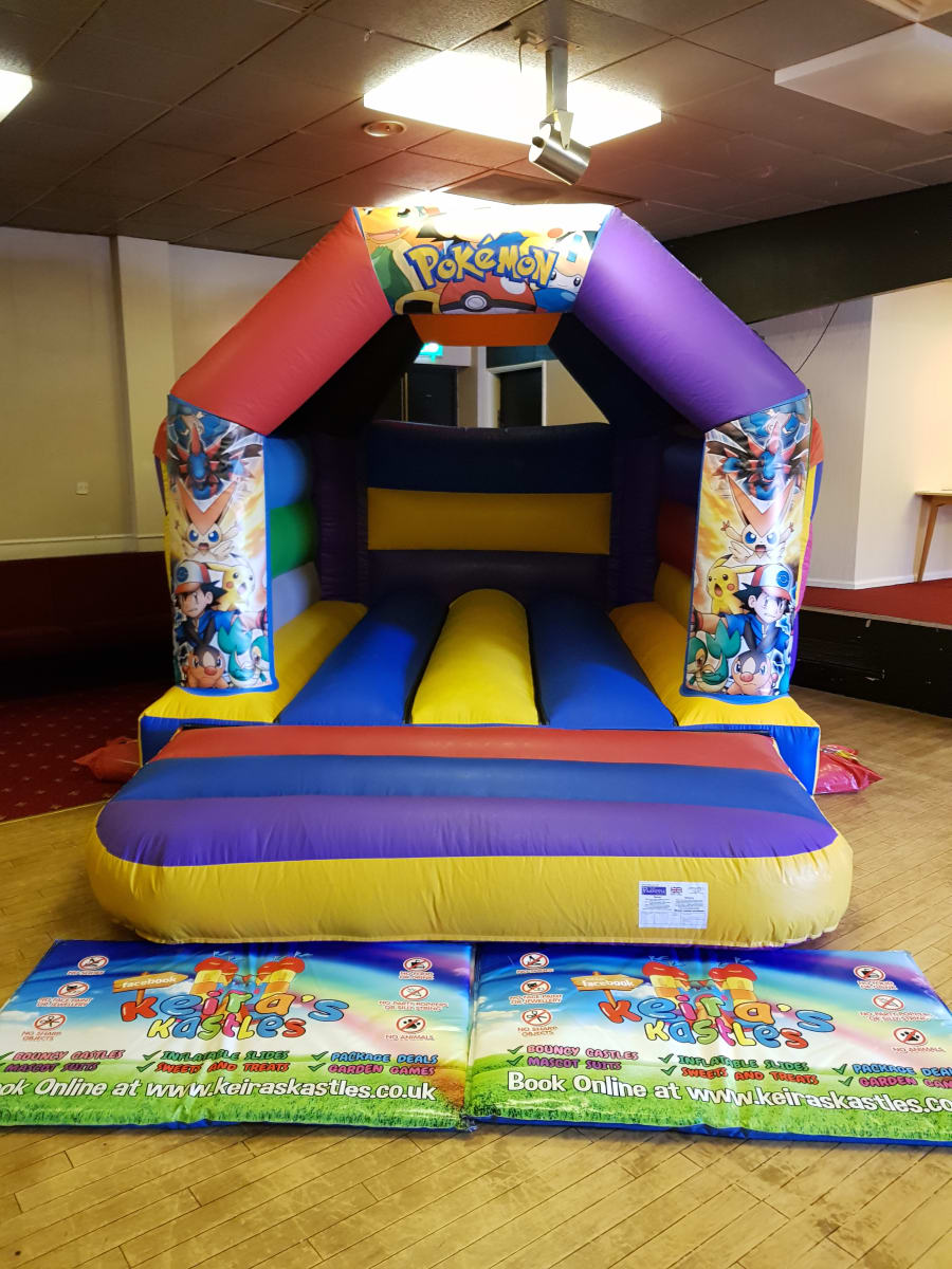 Here is our Pokemon bouncy castle, a multi coloured castles with a Pokemon design on the front showing a range of Pokemon from the Television show.