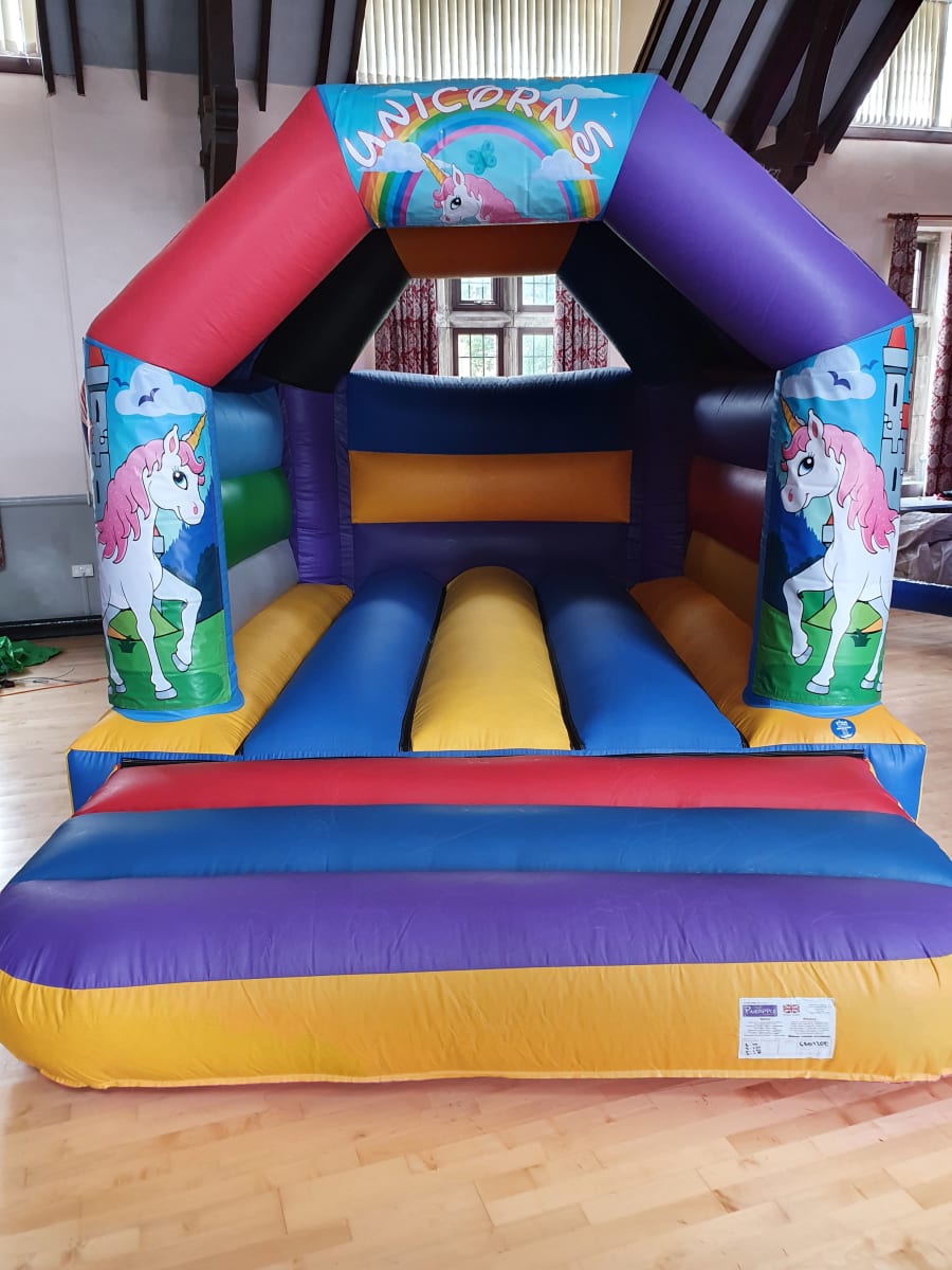 Here is our Unicorn bouncy castle, a multi coloured castles with a Unicorn design on the front showing a number of unicorns with a castle background.